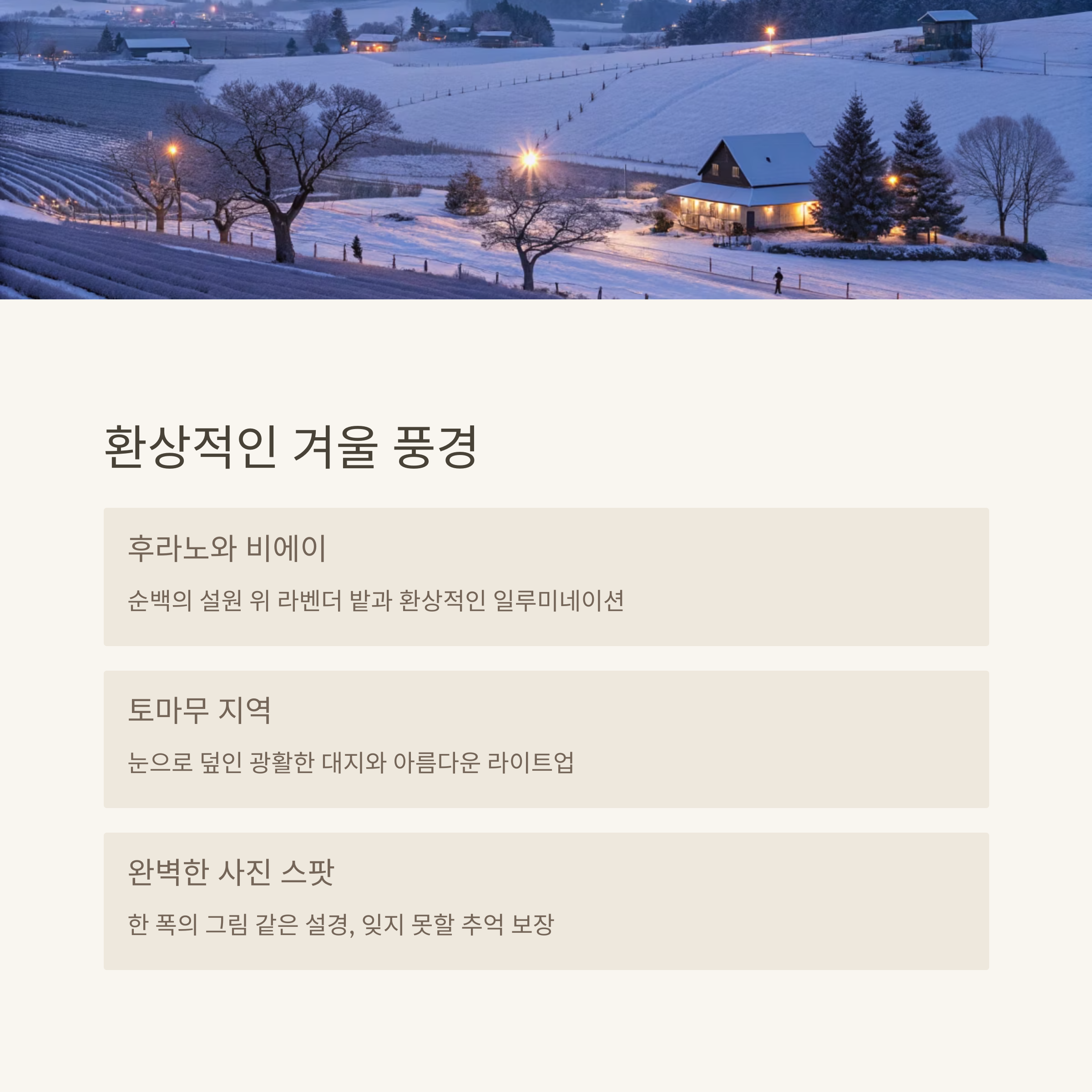 | 삿포로·아사히카와 겨울 축제는 세계적 규모입니다. | 후라노·비에이의 일루미네이션이 유명합니다. | 스키, 빙어낚시, 아이스 빌리지 체험이 가능합니다. |