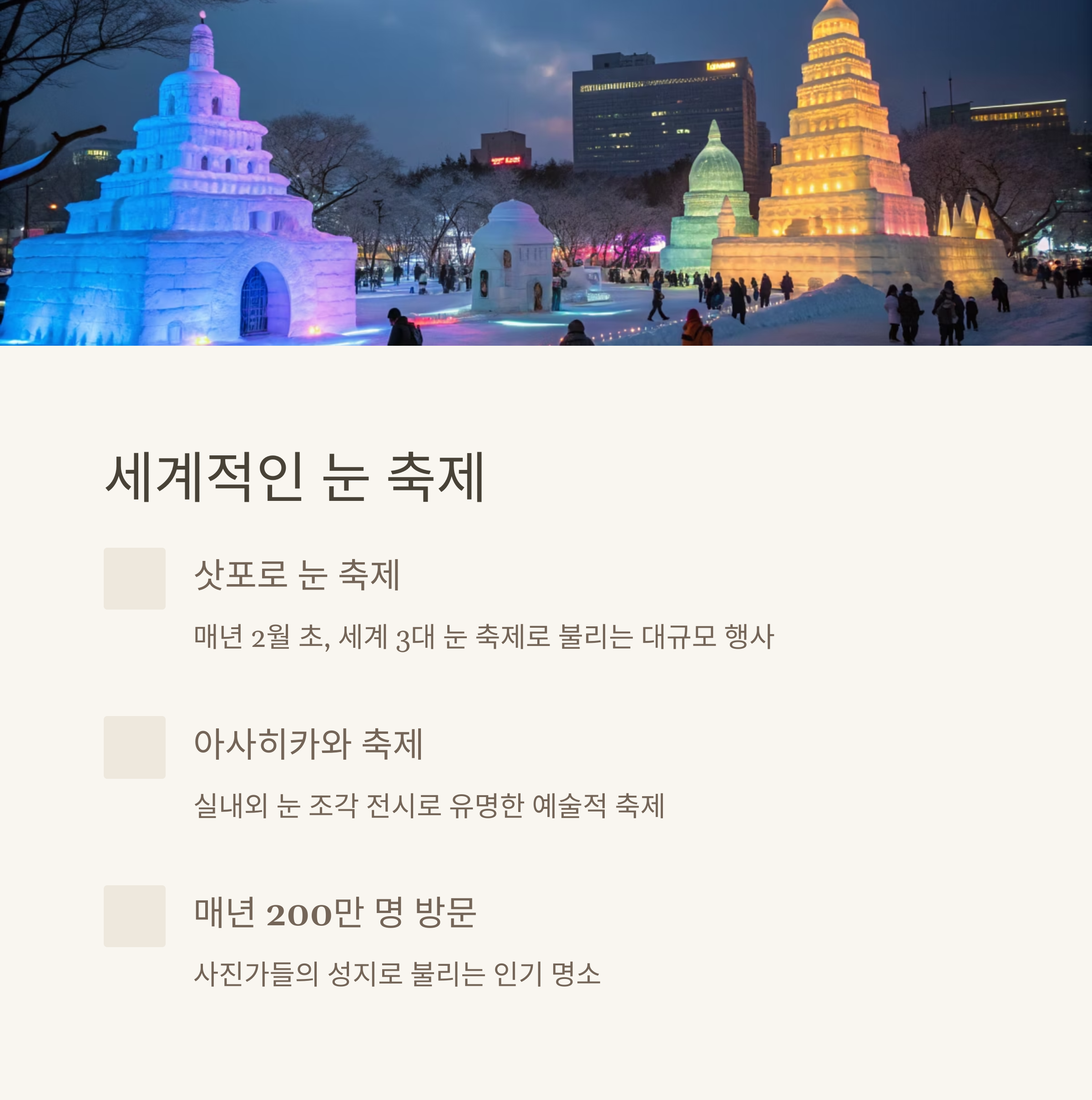 | 삿포로 눈 축제 | 세계 3대 눈 축제로 꼽히는 겨울 대표 이벤트 |