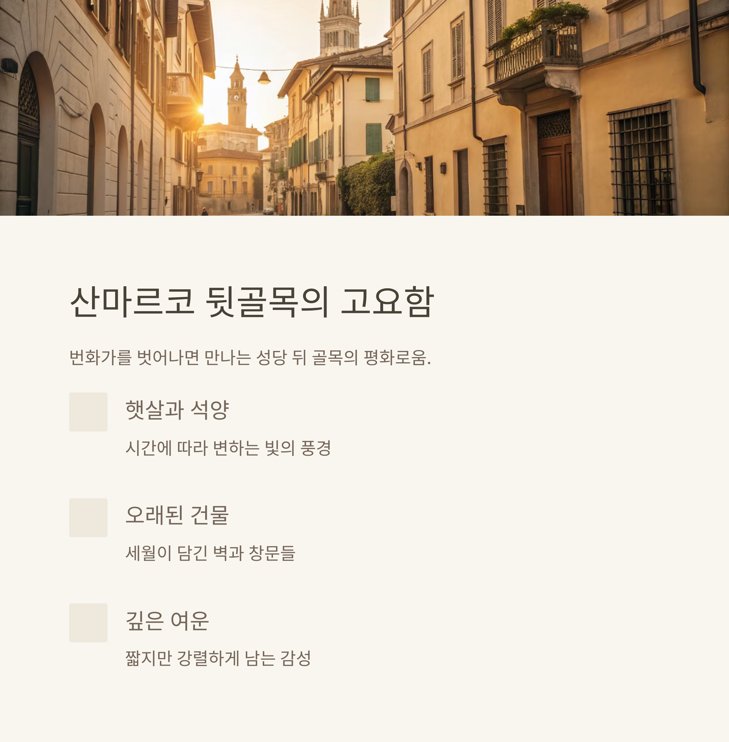 쇼핑몰 근처의 북적임을 벗어나 ‘산마르코 성당’ 뒷골목으로 향해보세요.