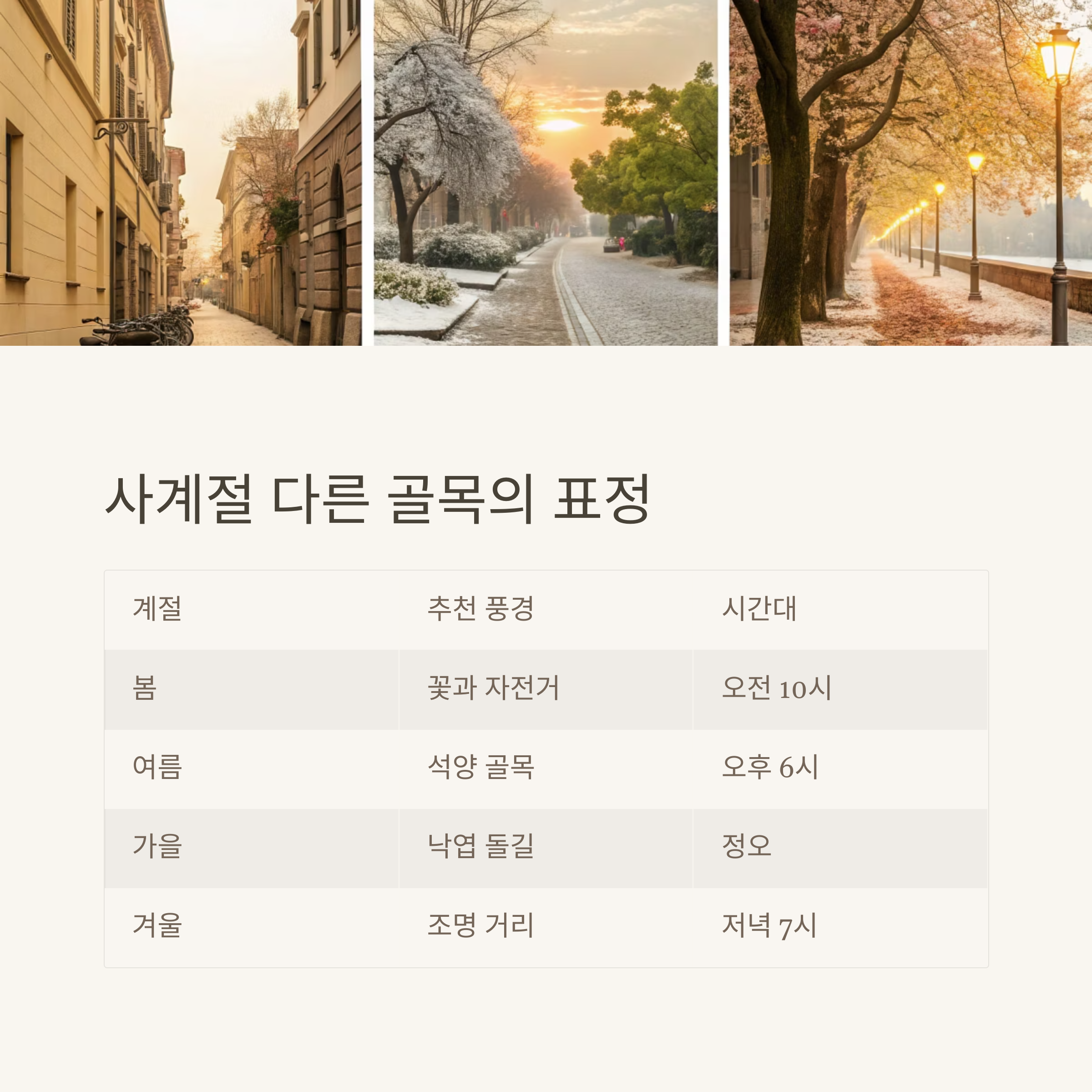 | 여름 | 석양 속 오렌지 빛 골목 | 오후 6시 무렵 카페 타임 |