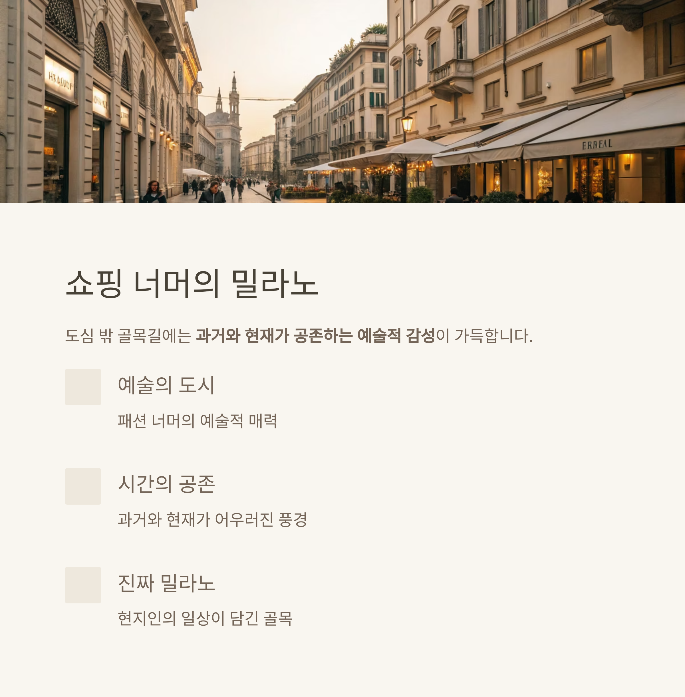 이번 글에서는 단순한 쇼핑이 아닌, 걸으며 느끼는 밀라노의 진짜 풍경과