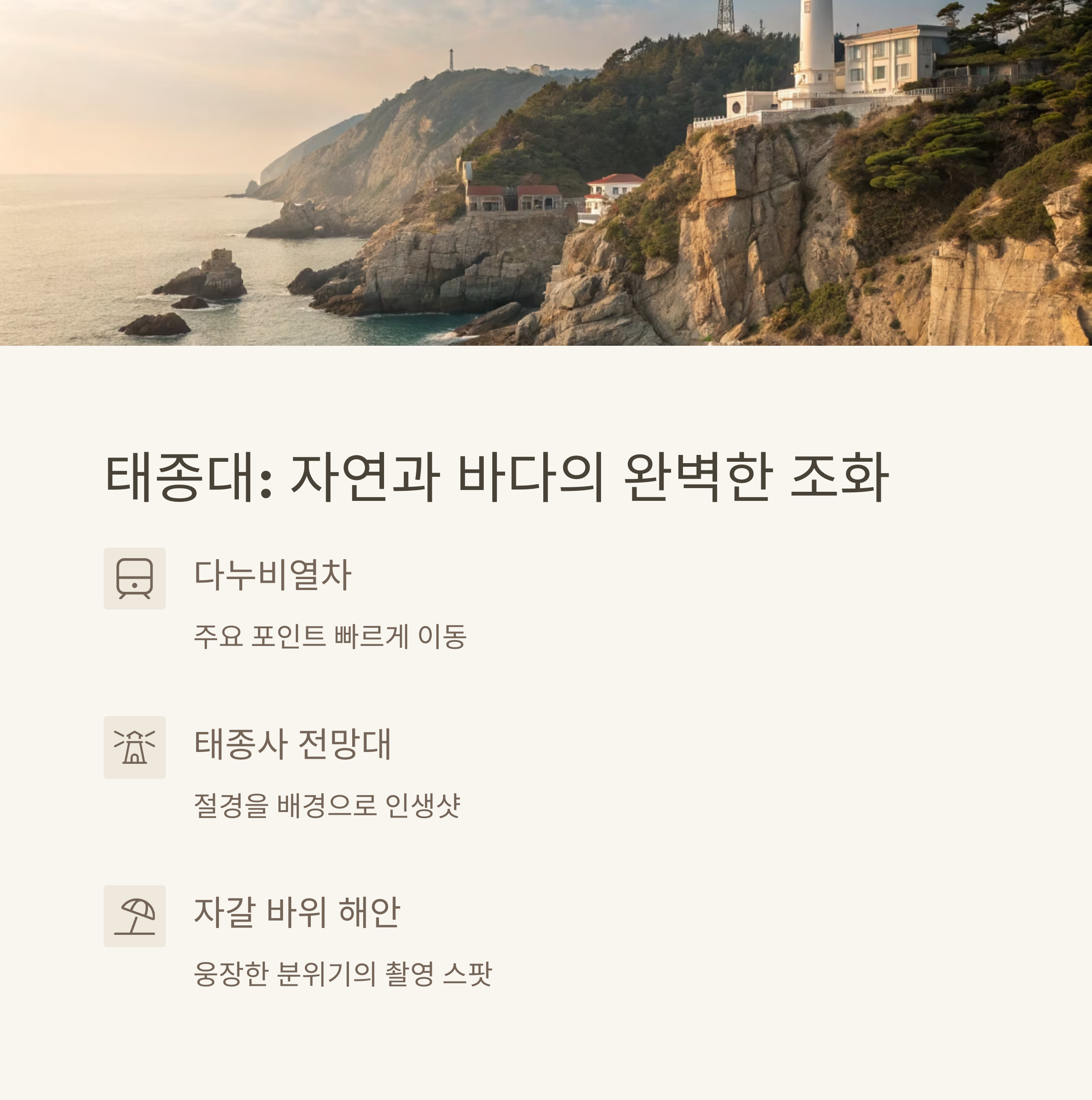 | 태종대 | 자연 경관 | 다누비열차 활용 | 정오 전후 |