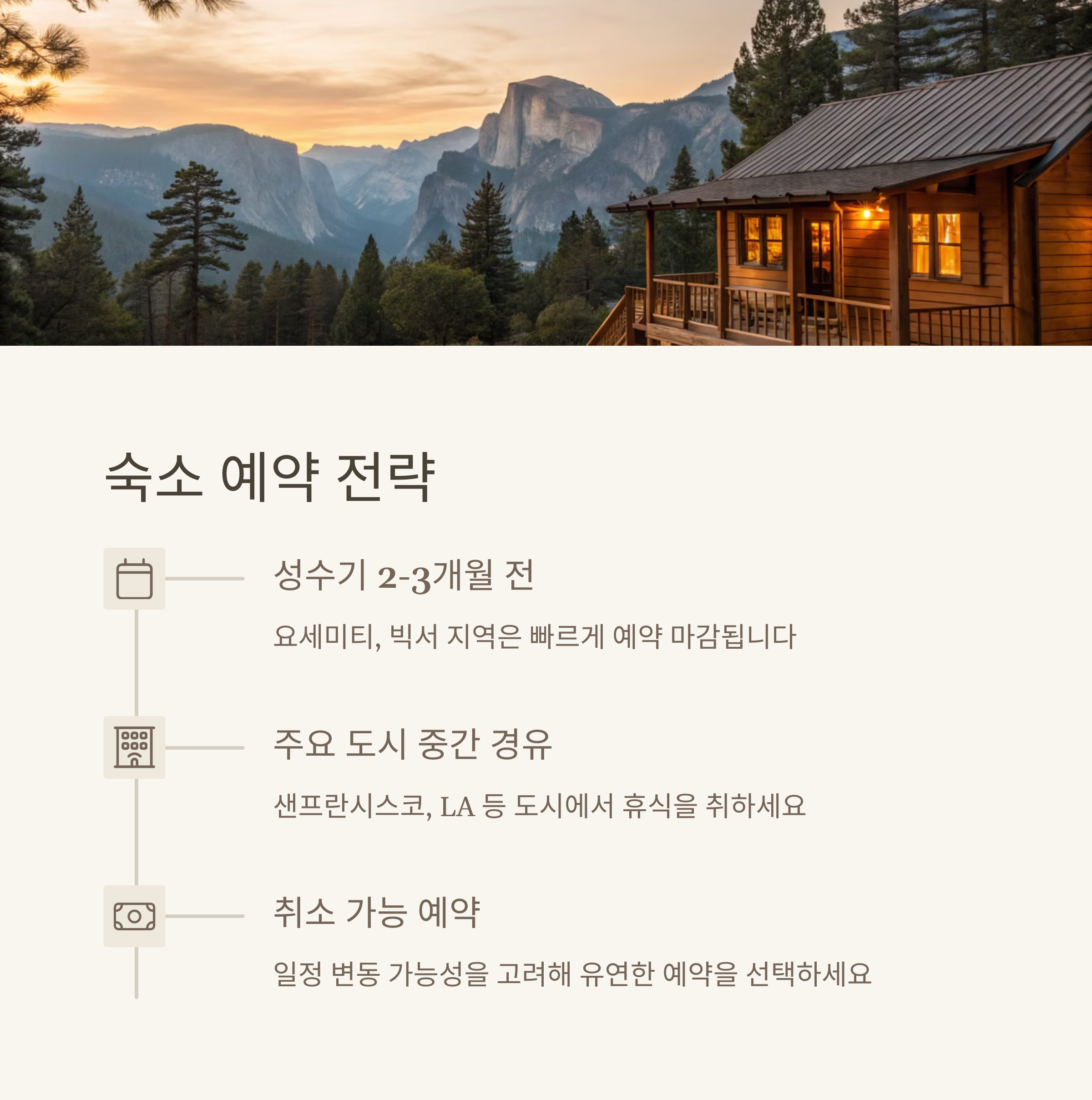 숙소 예약은 여행 시즌에 따라 미리 준비해야 합니다. 요세미티나 데스밸리 국립공원 근처는 특히 성수기에는 몇 달 전부터 만실이 되는 경우가 많기 때문에 유명 코스별 루트 설정과 숙소 체크는 로드트립의 성공을 좌우하는 중요한 요소입니다. 또한 국립공원 패스인 America the Beautiful을 구매하면 미국 전역의 국립공원을 자유롭게 입장할 수 있어 시간과 비용을 모두 아낄 수 있습니다.
