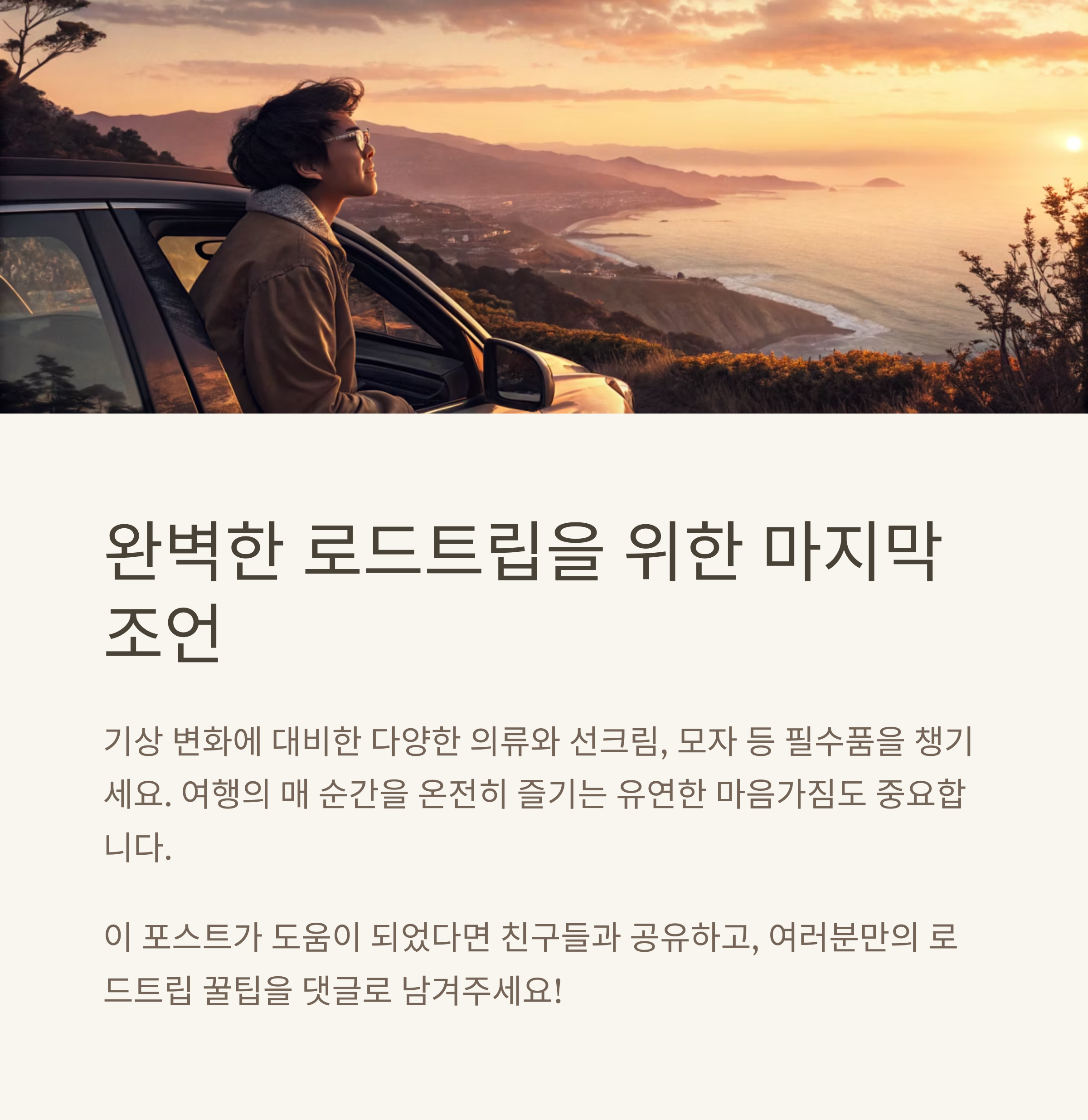 캘리포니아 로드트립은 단순한 여행을 넘어 미국 대자연을 직접 체험하는 특별한 경험입니다. 철저한 준비는 물론이고, 날씨와 환경 변화에 민감하게 대응할 수 있는 유연한 마음가짐도 필요합니다. 본문에서 안내드린 체크리스트를 따라 준비하신다면 불필요한 스트레스 없이 여행을 즐기실 수 있을 것입니다. 매 순간을 놓치지 않고 온전히 느끼며, 각 코스의 매력을 충분히 만끽하시길 바랍니다.