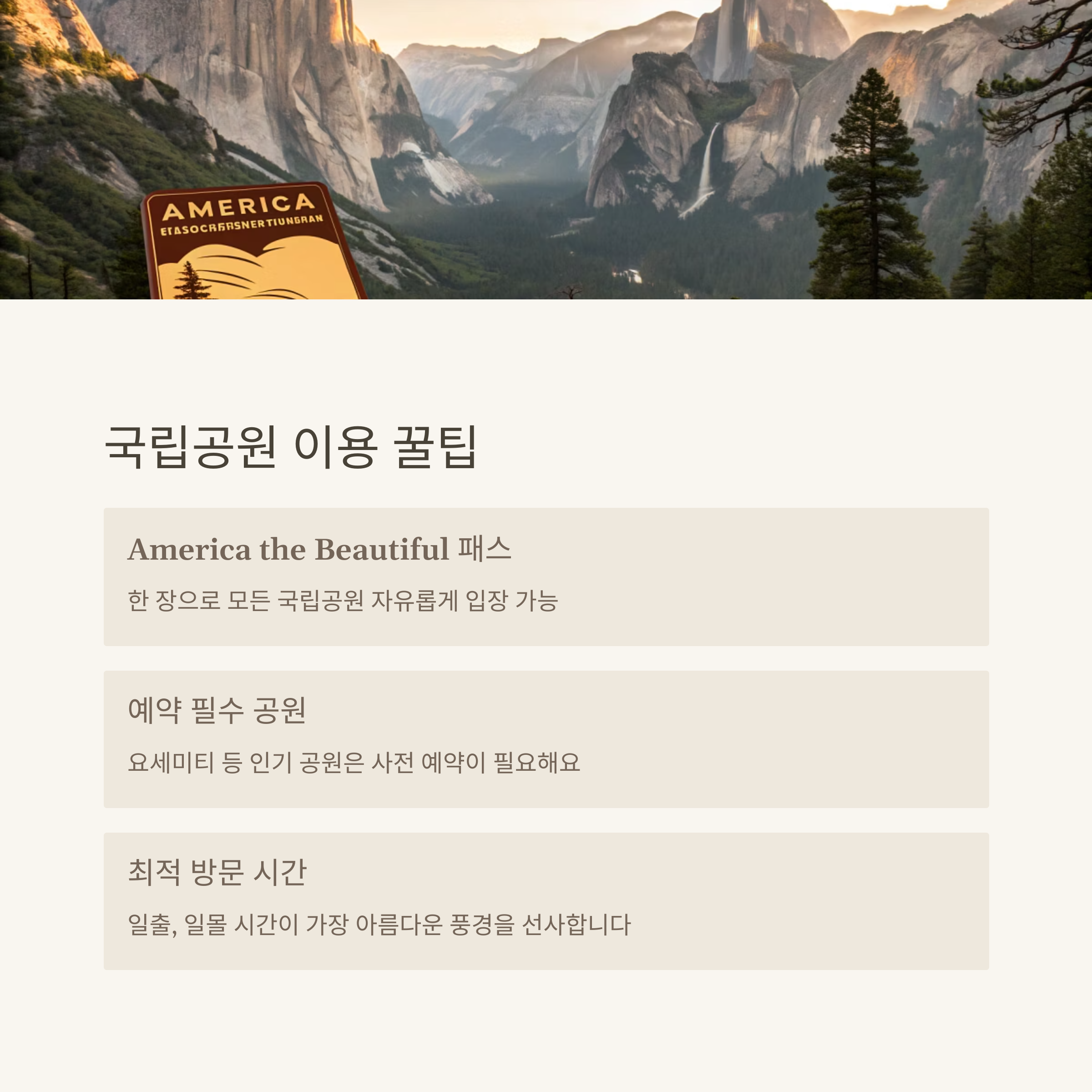 | 장거리 대비 오프라인 지도, 응급약품도 챙기세요 | 특히 요세미티 주변은 빠르게 만실됩니다 | 한 장으로 다양한 국립공원 입장 가능해 효율적 |