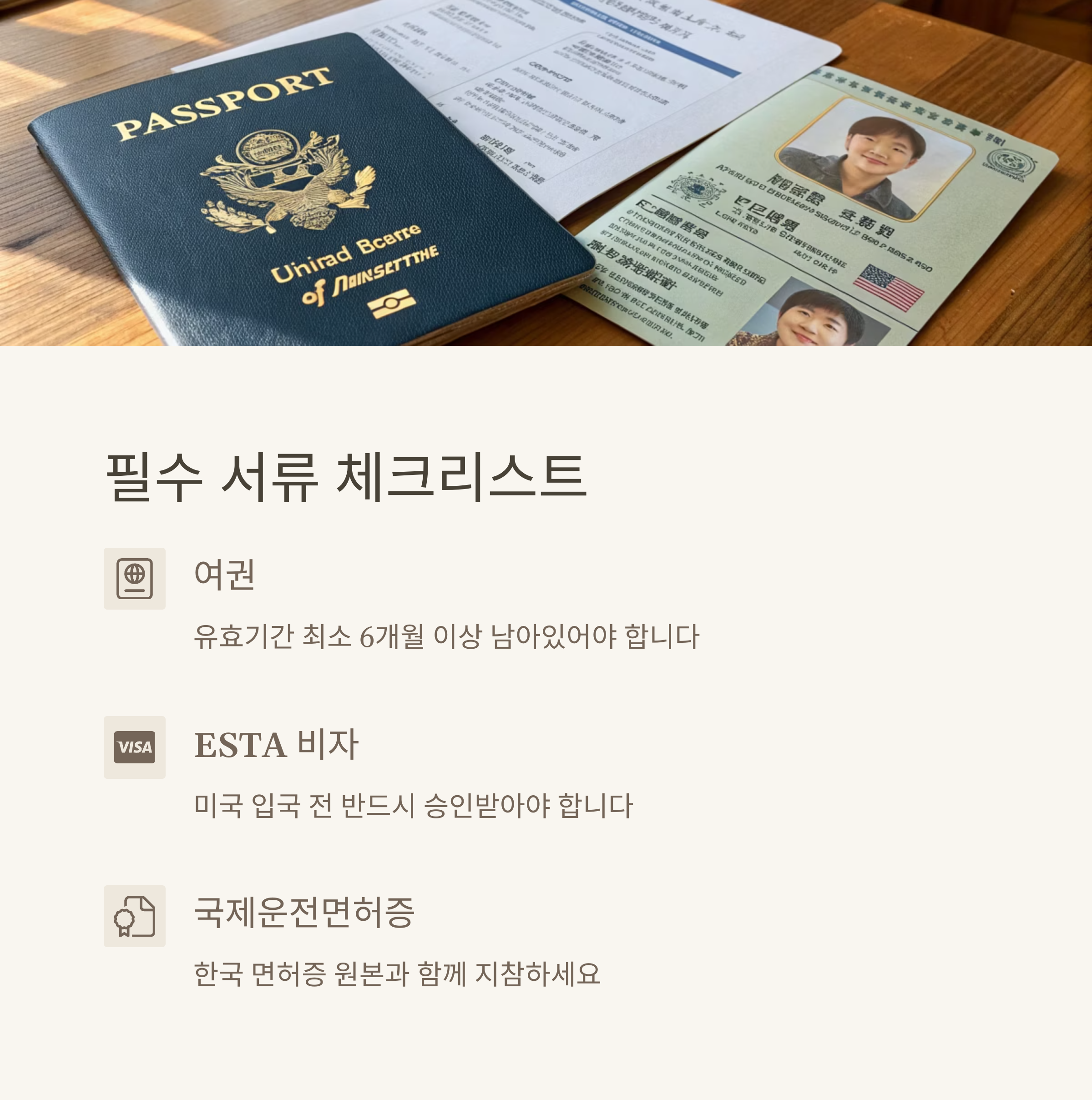 | 로드트립 필수 서류 | 여권, ESTA, 국제운전면허증은 꼭 사전에 준비해야 해요. |